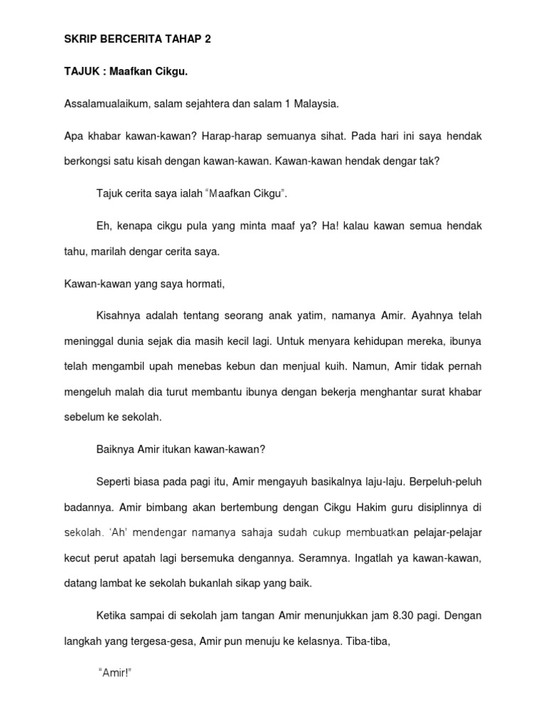 Copy paste cerita kanak kanak by mohammad yaqin 19290 views. Entah apa yang ingin dilakukannya. Skrip bercerita tahap 2 ppd kuala langat nama peserta: Skrip cerita tahap 1 si tanggang anak derhaka hei… skrip cerita pertandingan bercerita. Zarif amsyar 1 week ago. Skrip bercerita tahap 2 peserta: Definisi/arti kata 'skrip' di kamus besar bahasa indonesia (kbbi) adalah n 1 naskah (film, drama, dan sebagainya); 6) loceng akan dibunyikan sekali sahaja menandakan masa bercerita telah tamat.tiada markah akan diberikan selepas loceng dibunyikan. Skrip bercerita tahap 2 peserta: Dirinya masih dihantui apa yang dilihatnya di rumah pak bejo malam itu. Pada akhirnya ia lebih memilih keluar kamarnya. Cara menulis biografi yang bercerita dengan pendekatan nonfiksi kreatif. Ada blt umkm tahap ii, ini syarat hingga cara mendapatkannya.