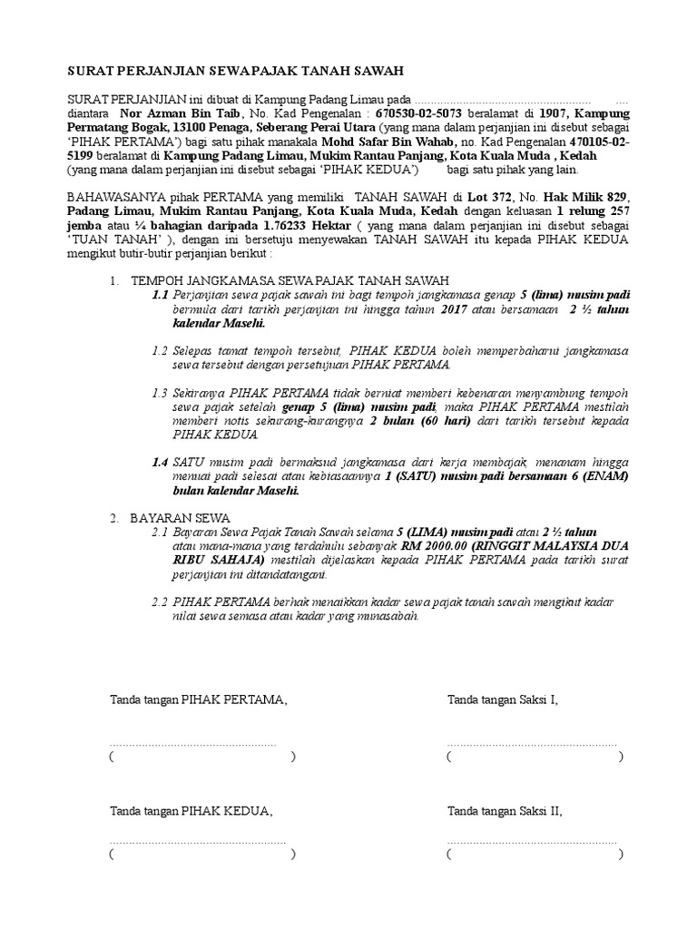 More images for contoh surat perjanjian sewa tanah di malaysia » See full list on lamudi.co.id Surat perjanjian jual beli tanah kampung. Yang bertanda tangan di bawah ini: (ii) ia mempunyai kuasa untuk memasuki dan melaksanakan tanggungjawab serta urusan di bawah perjanjian ini;